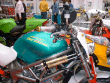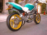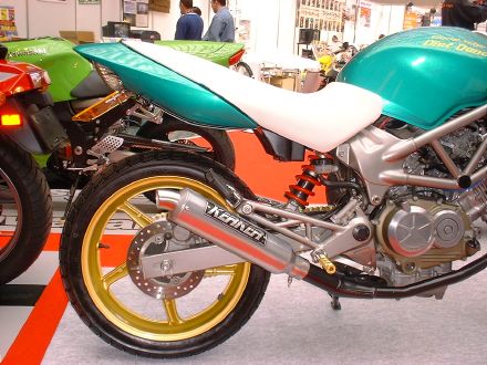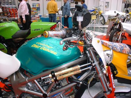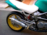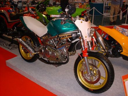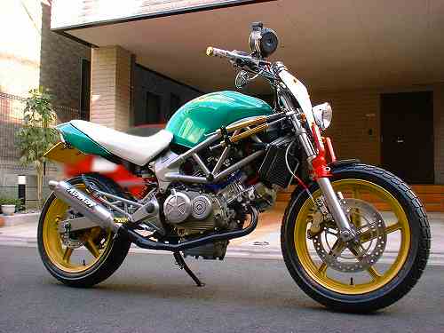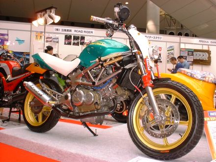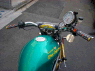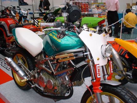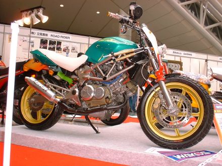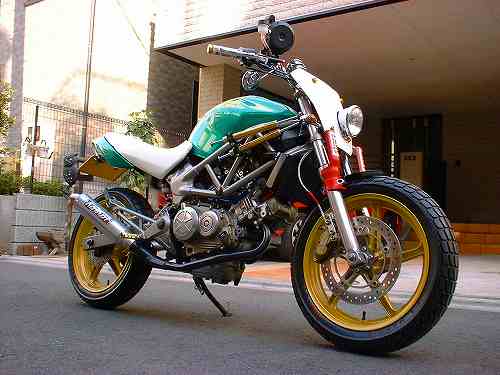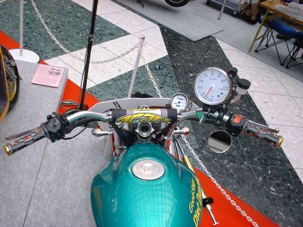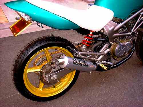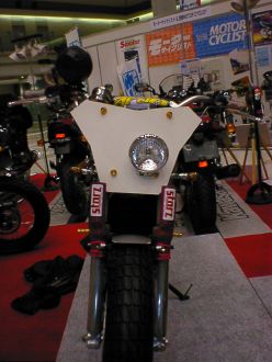 | Dirt Dancer ベース車両 HONDA VTR 250 新しいダートトラックマシンを提案するGood-Stage Dirt Dancer ダートトラック主流の単気筒空冷250ccに弱さを感じ作成されたGood-StageオリジナルDirt Dancerです。ベース車両はHONDA・VTR250水冷4ストロークDOHC90度Vツインエンジン、トラス構造のチューブフレームピポットレス理論、41φフロントォーク、全く新しいダートトラッカーの誕生です。 ダートトラッカーになかった新しいデザインと、水冷Vツインの力と良く回るエンジン、各部カスタムされ重要な車重も136kgと軽くバランスの取れたスペックにより、ロングツーリングでも疲れないスタビリティー、ストリート・ダートコースでも誰もが楽しめる強い存在感ある車両に仕上がりました。 Good-Stage Dirt Dancerはオリジナルコンプリート車両でどなたにも購入いただけます。カラーオダーシステムの採用により、ボディー色9種類・フレーム色3種類・ホイール色4種類のカラー選択が出来ます。ベースコンプリート+オリジナルカスタムも可能です。 エアインジェクションの採用によりクリーンな排ガスも実現しております。 Good-Stage Dirt Dancer ベースコンプリート 新車価格 ¥499.000.− 展示車両ステアリング右に装着されたメータは、本場の車両はもちろんダートコース走行時のカウンターステアに最も見やすい位置設定となっております。 |